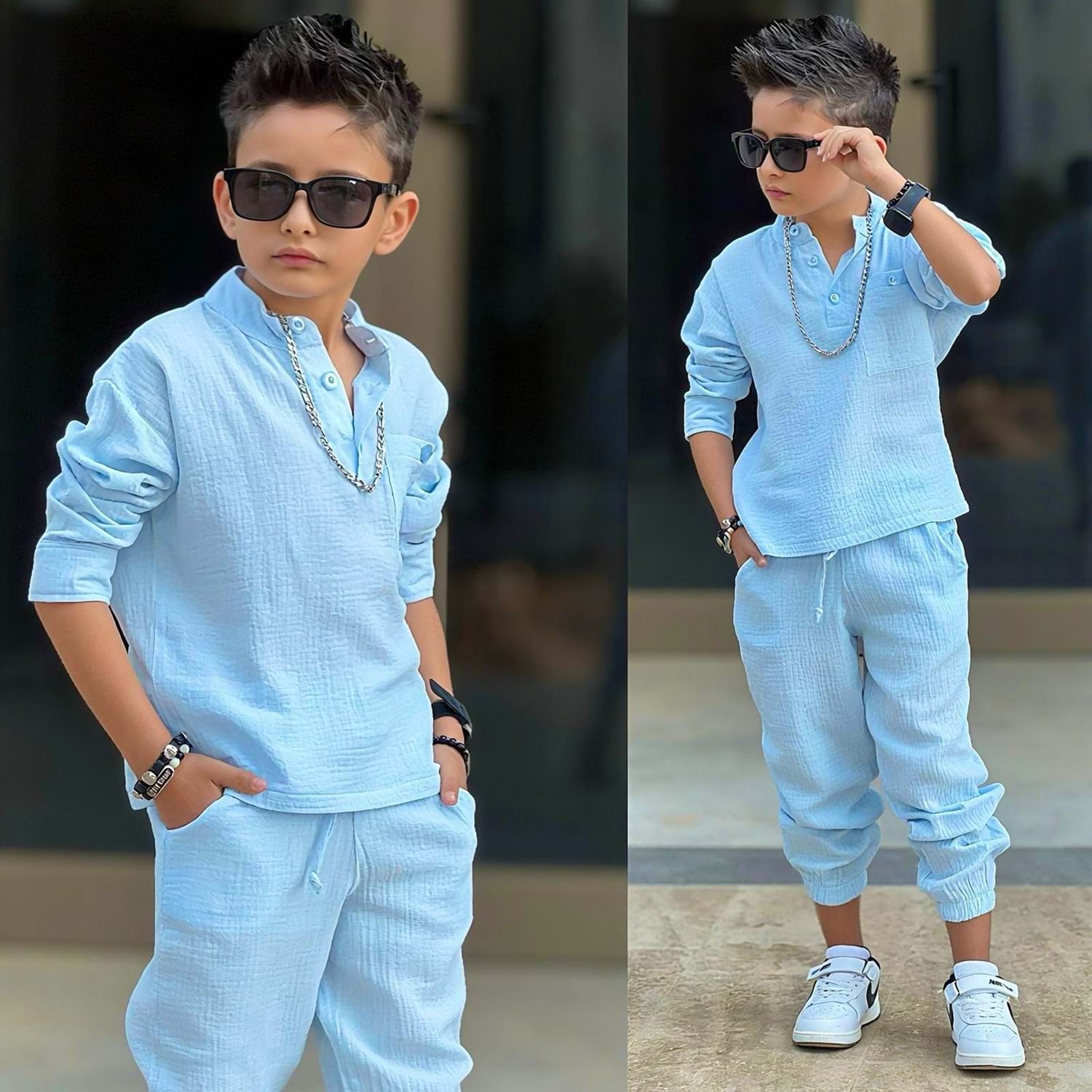 - Düz deseniyle sadeliği ön planda tutan bu takım, diğer aksesuarlarla kolayca kombinlenebilir.