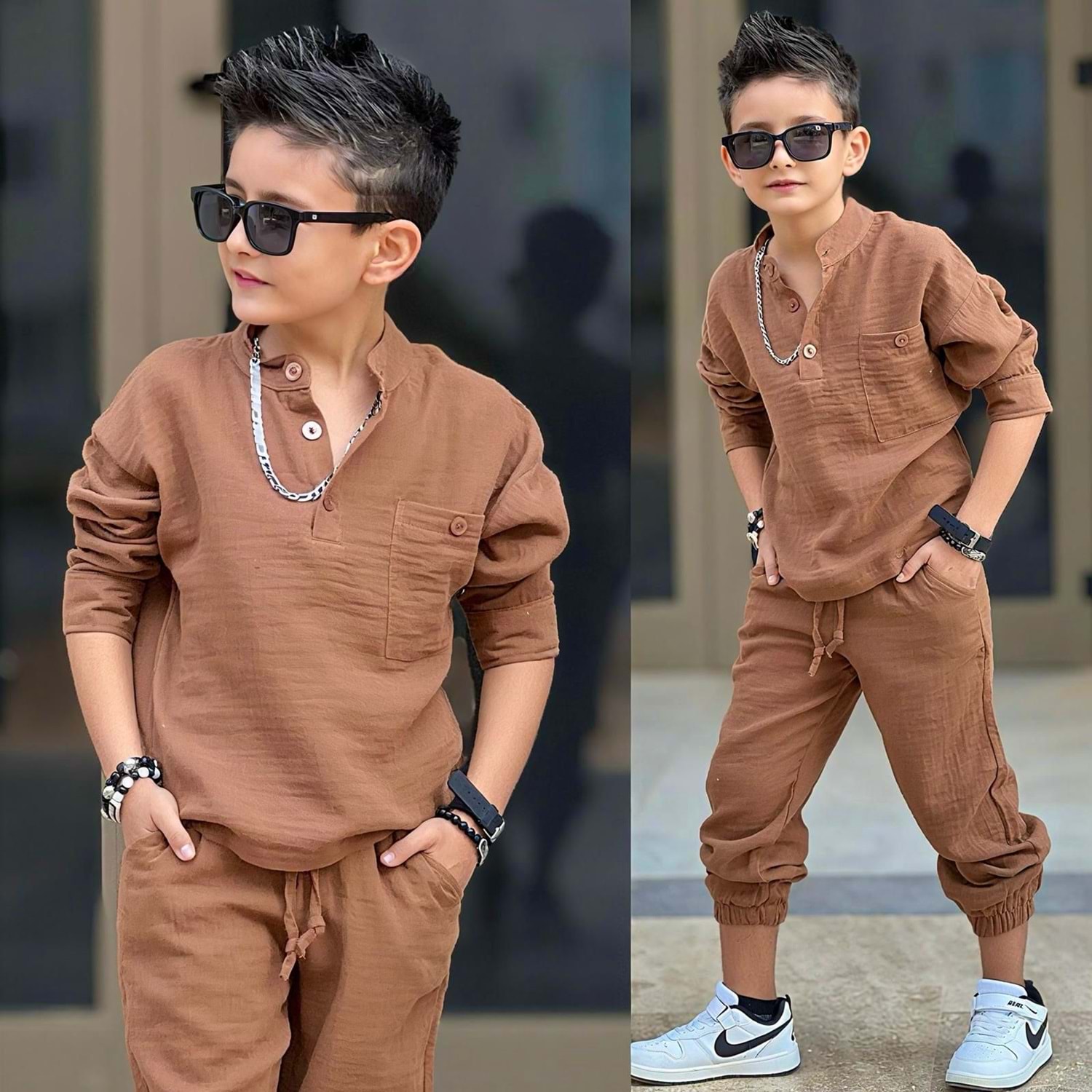 - Düz deseniyle sadeliği ön planda tutan bu takım, diğer aksesuarlarla kolayca kombinlenebilir.