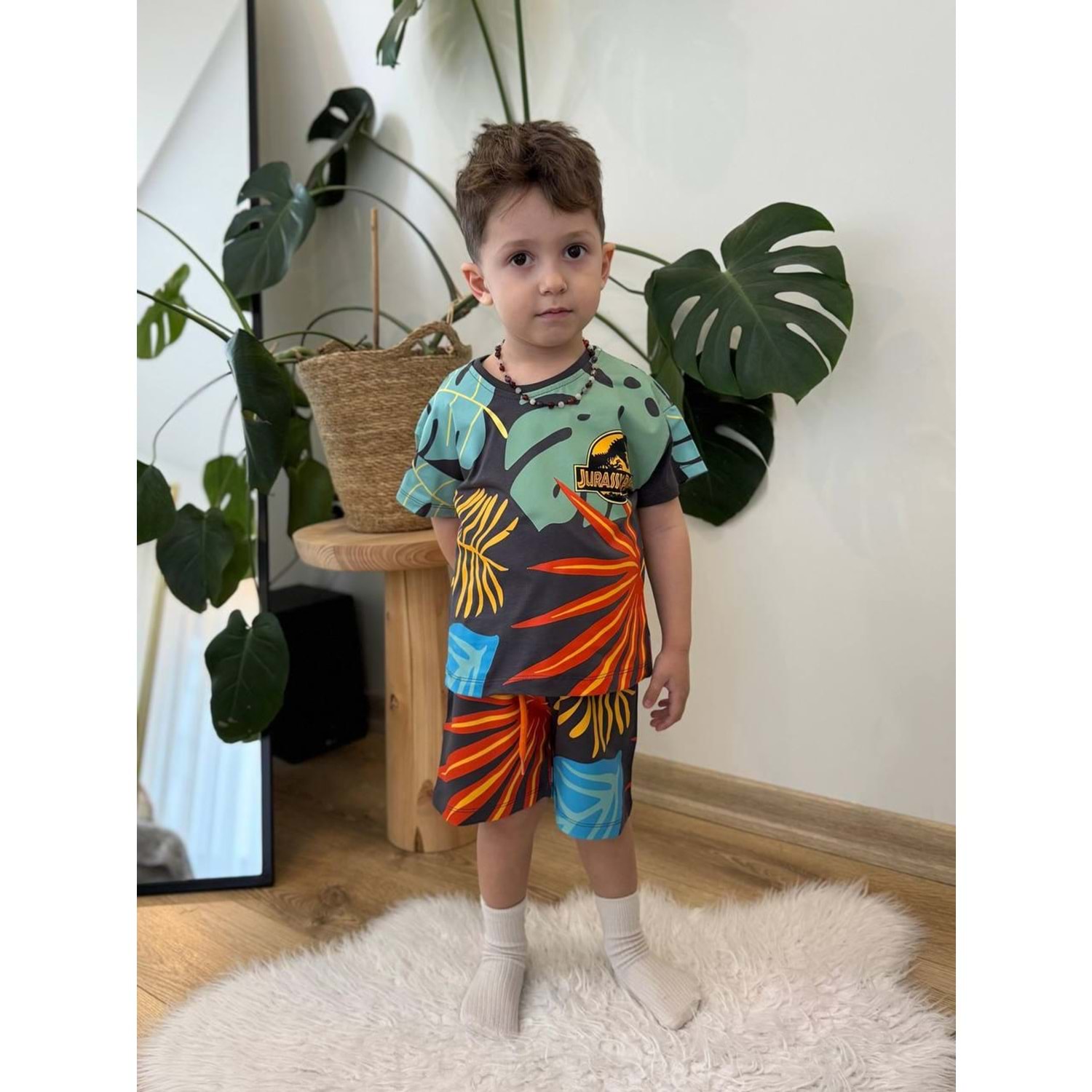 West Jurassıc Park Baskılı Palmiye Desenli Erkek Şortlu Takım 2-8 Yaş -8181240 - GRİ