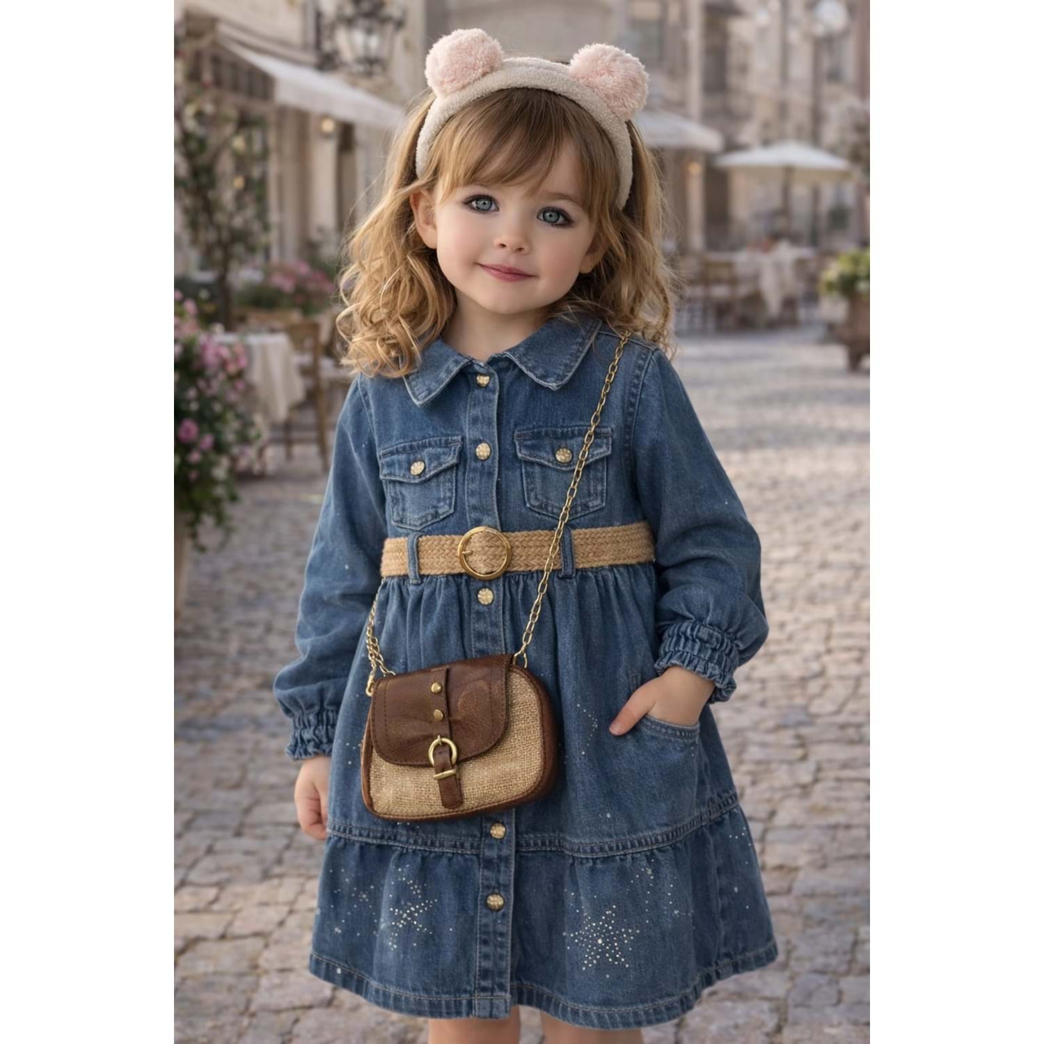Sago Beli Kemerli Çantalı 2-5 Yaş Kot Elbise-2261360 - MAVİ